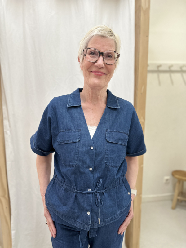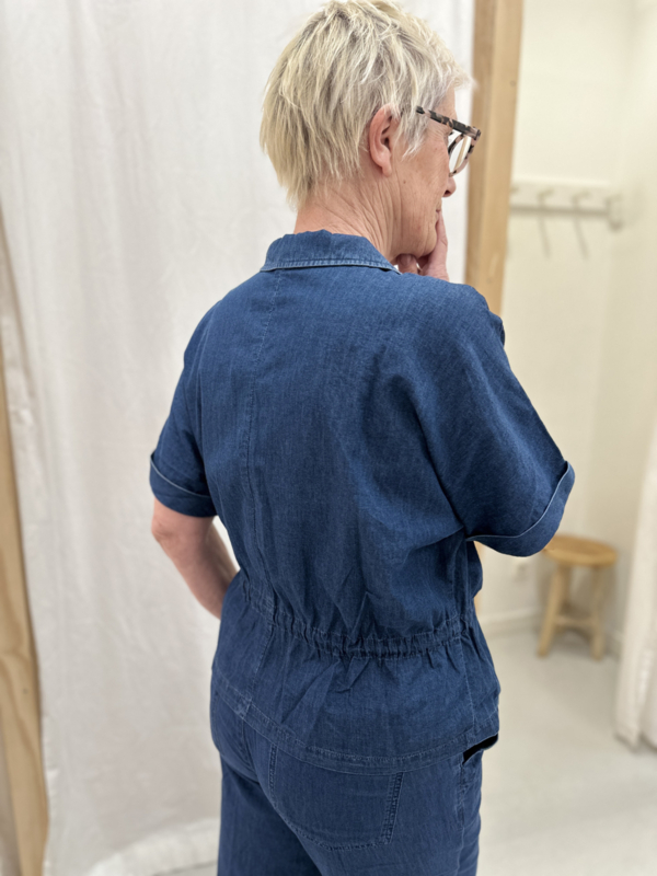 De Drew Drawstring Denim is een denim top met een aangeknipte mouw en een regular fit. De top heeft een omslag bij de mouw, een knoopsluiting en een drawstring in de taille. De Drew Drawstring Denim heeft klepzakken op het voorpand