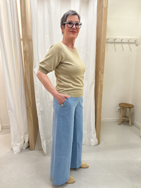 De Sweet Sparkle is een fijngebreide top met pofmouwen. De top heeft een geribde boord langs de hals, aan het uiteinde van de mouwen en aan de onderkant. In het breisel zit een lichte glitter waardoor de top een mooie glans krijgt